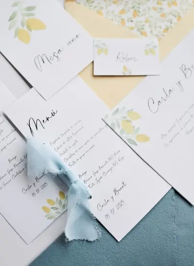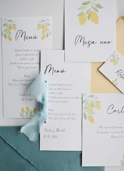 Este modelo evoca la frescura y vitalidad de los limones, con ilustraciones sutiles que combinan tonos amarillos y verdes. Es perfecto para bodas veraniegas o eventos al aire libre que deseen un toque natural y alegre, sin perder la sofisticación que caracteriza a la línea clásica.