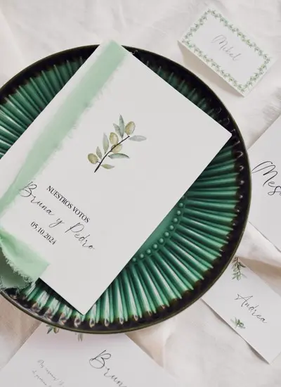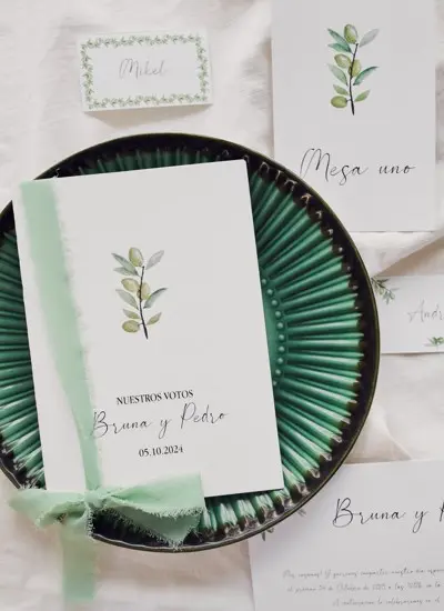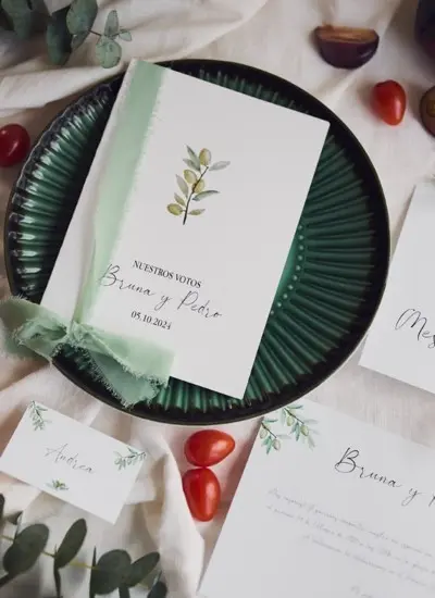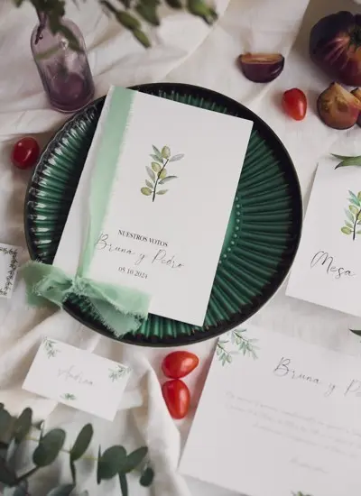 El olivo, símbolo de paz y prosperidad, se refleja en este diseño elegante, con ilustraciones finas y delicadas que evocan la tranquilidad de un paisaje mediterráneo. Es perfecto para bodas con temática rústica o de destino.