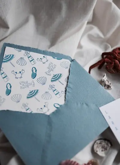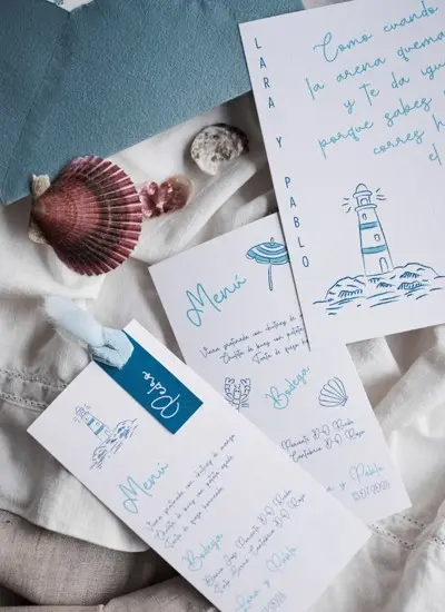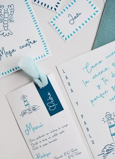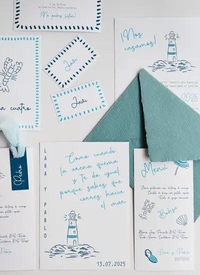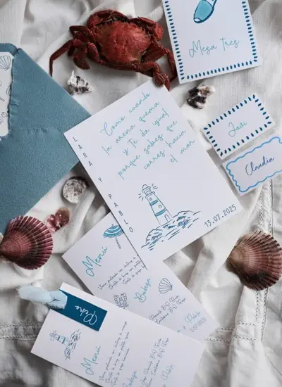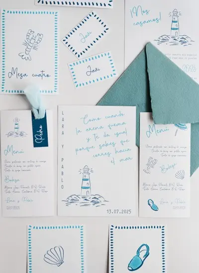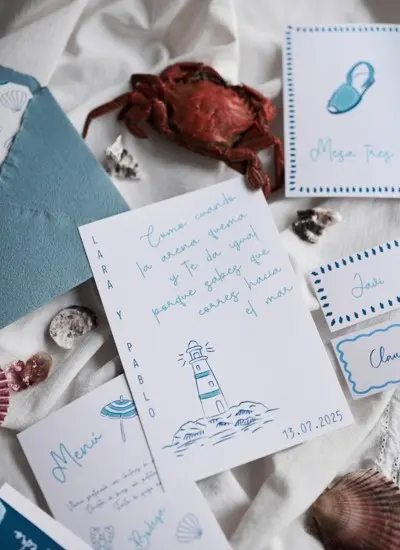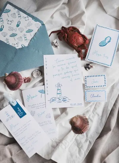 Inspirada en la tranquilidad y belleza de la isla de Formentera, esta colección presenta tonos azules serenos que evocan el mar Mediterráneo. El diseño se centra en un delicado faro y símbolos playeros, creando una atmósfera fresca y relajante. Perfecta para bodas frente al mar o en entornos naturales que buscan una estética suave y romántica, en un entorno veraniego y elegante.